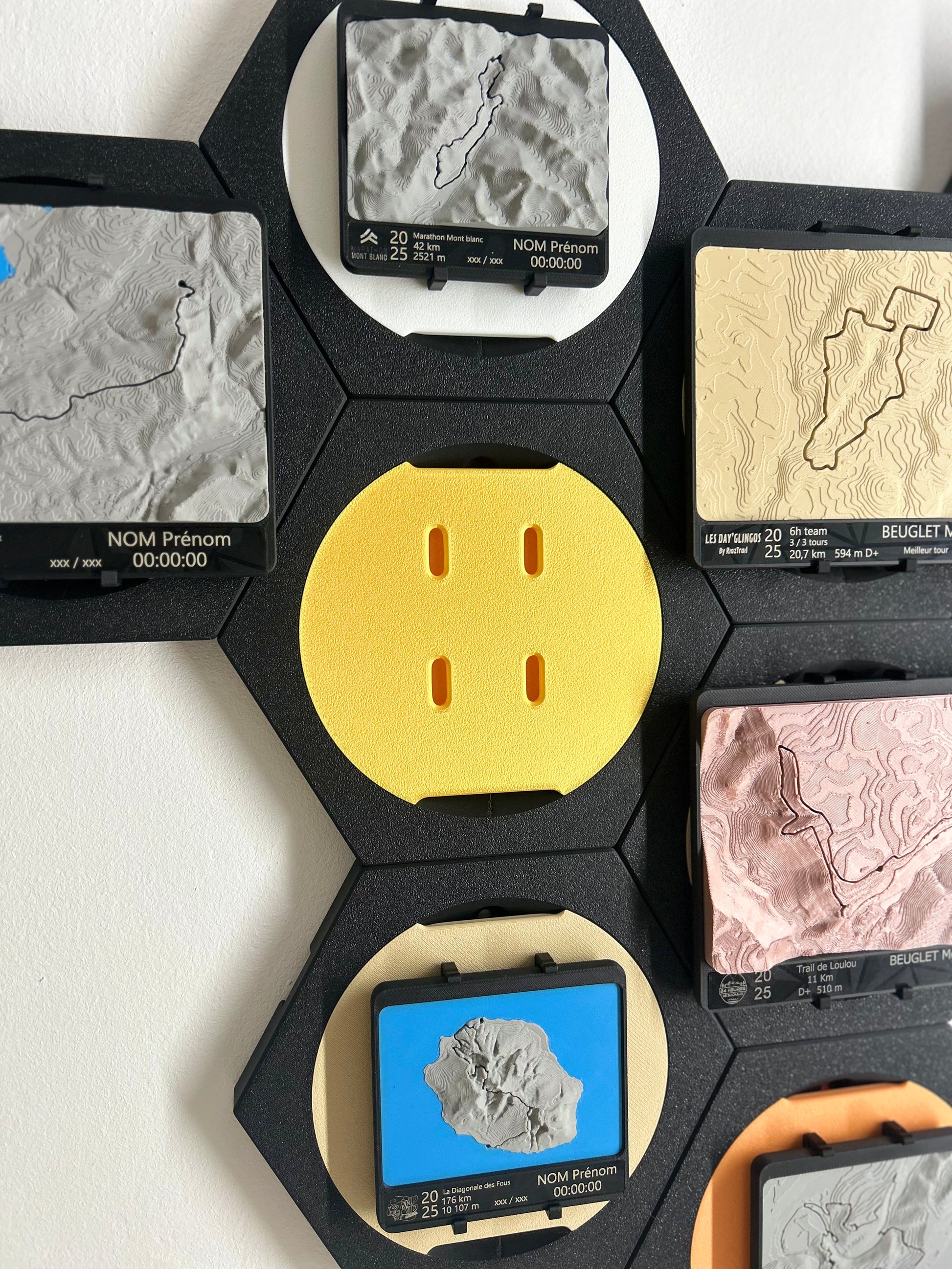 Transforme tes médailles en une véritable fresque sportive grâce à nos supports muraux hexagonaux. Conçus pour accueillir aussi bien les médailles classiques (tour de cou) que les médailles topographiques My Run 3D, ces supports modulaires te permettent de composer un mur unique qui raconte ton histoire, course après course.