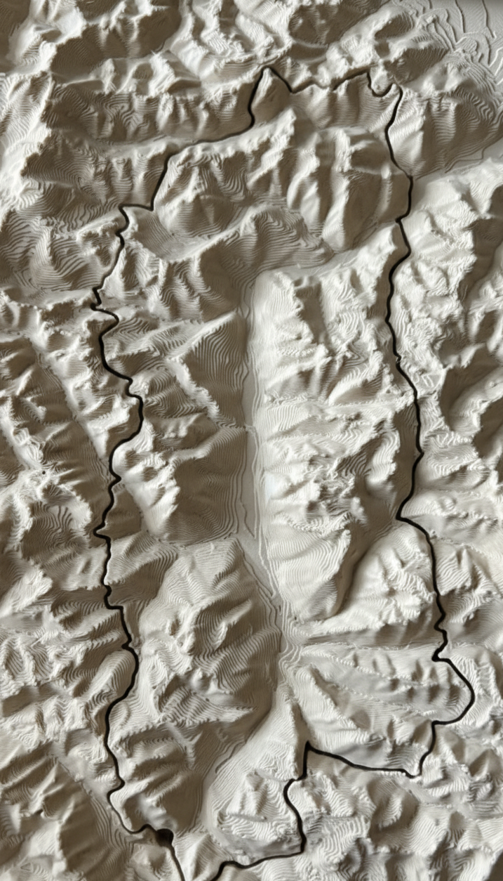 Ce cadre unique met en valeur le Val d’Aoste en relief 3D, avec le tracé complet du Tor des Géants, un ultra-trail mythique de 330 km et 28 000 m de dénivelé, serpentant à travers les sommets les plus emblématiques des Alpes italiennes.